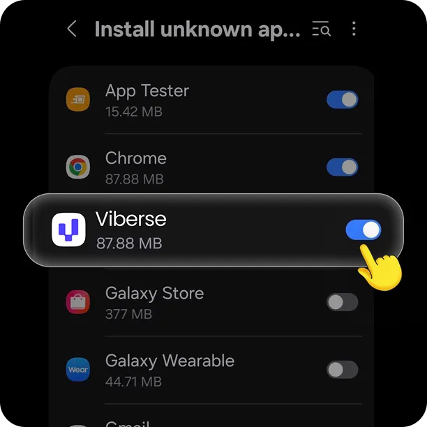 If prompted, allow installs from Viberse (Settings > Security > Install unknown apps).
